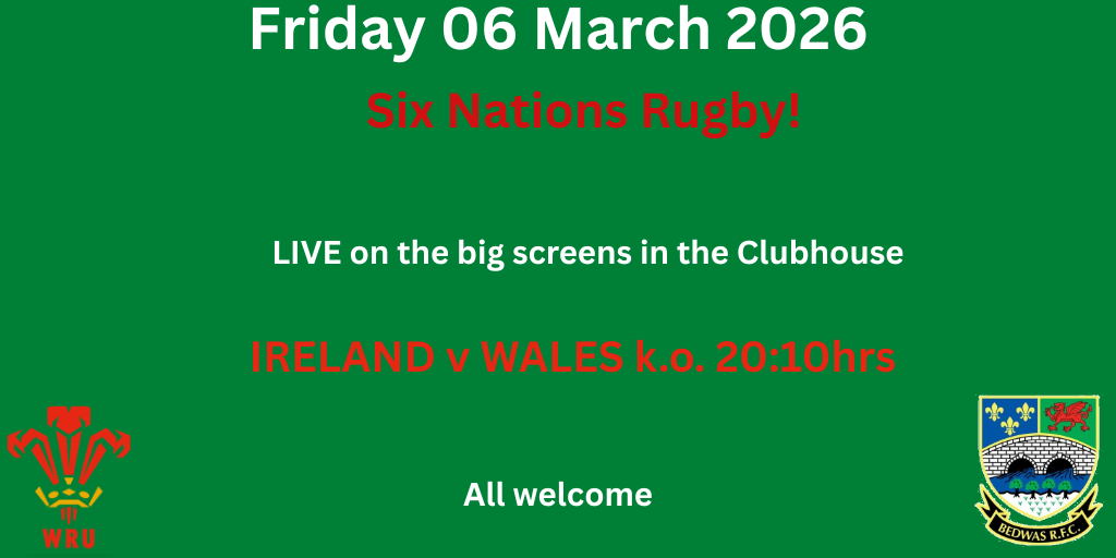 Come and join us to watch the penultimate game of this season’s Six Nations as the Wales team travel to Dublin on Friday 6th March. Kick-off is at 20-10 hrs.